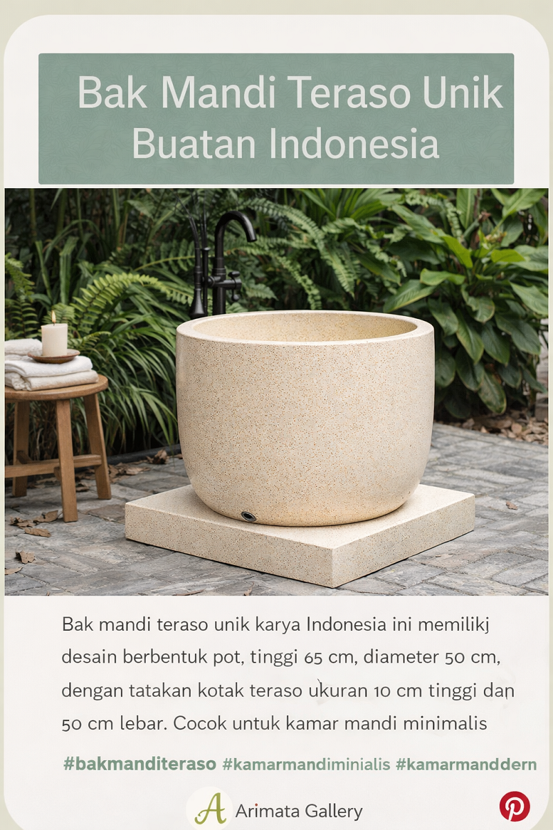 Diproduksi secara handmade oleh pengrajin teraso berpengalaman, bak mandi ini dibuat dari material teraso padat yang dikenal kuat, stabil, dan tahan terhadap air. Proses pengerjaan dilakukan dengan detail tinggi untuk menghasilkan permukaan yang halus serta nyaman digunakan dalam jangka panjang. Setiap unit memiliki karakter unik yang menjadikannya tampil eksklusif dan tidak massal.